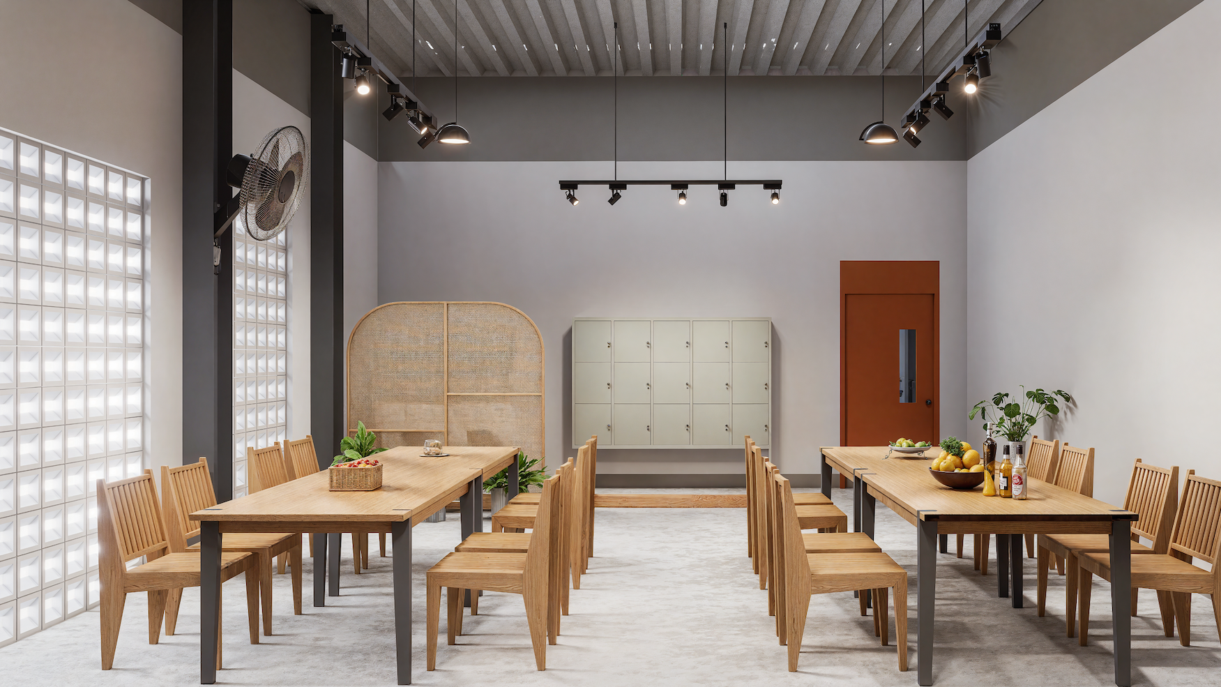 We combined the open kitchen and cafeteria and embraced contrast. To keep the industrial look, we opted for a polished concrete floor, but chose timber furniture to help warm up the space. The result is a space with bold visual rhythm but not harshness.