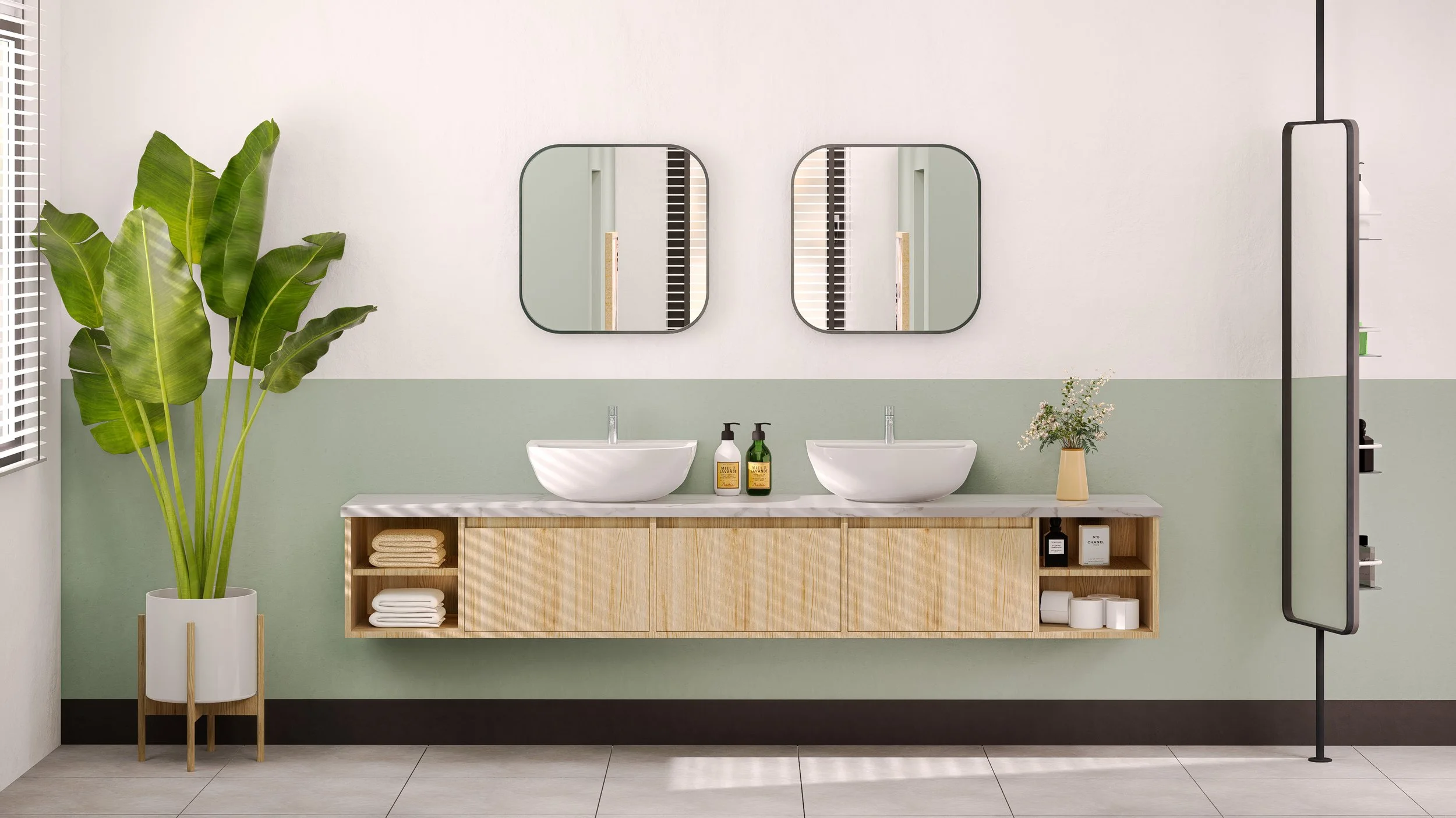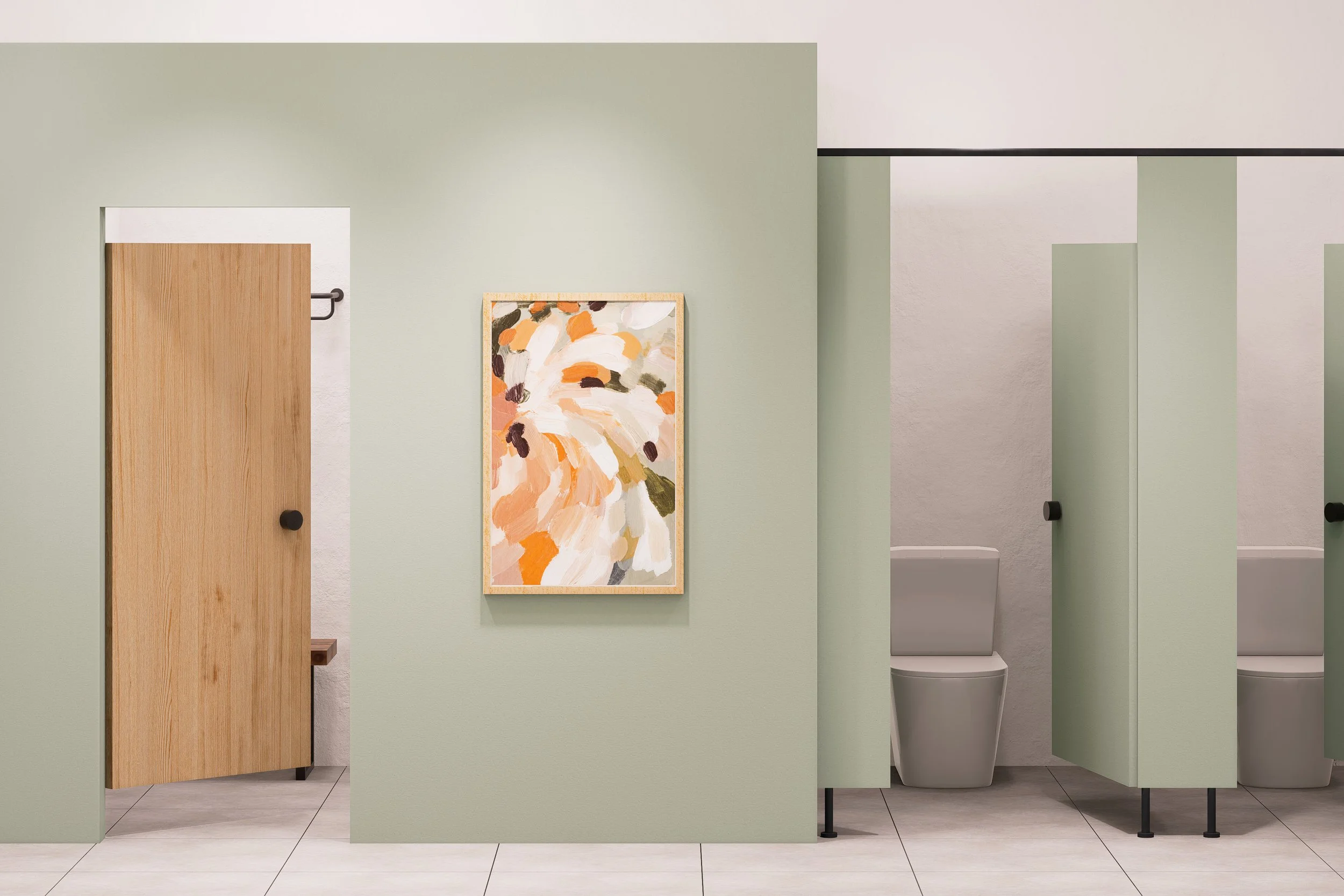 Keeping the overall color palette a soft neutral palette, we injected the unexpected with a splash of burnt orange for the door and mirror. Accents done right, is a high-impact move.